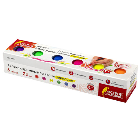 Краски акриловые по ткани НЕОН ОСТРОВ СОКРОВИЩ 6 цветов по 25 мл, 191697