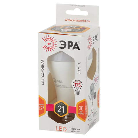 Лампа светодиодная ЭРА STD, 21 (175) Вт, цоколь E27, груша, теплый белый свет, 25000 ч., LED A65-21W-827-E27, Б0035331