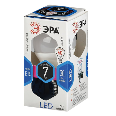 Лампа светодиодная ЭРА STD, 7 (60) Вт, цоколь E14, шар, нейтральный белый свет, 30000 ч., LED P45-7W-840-E14, Б0020551