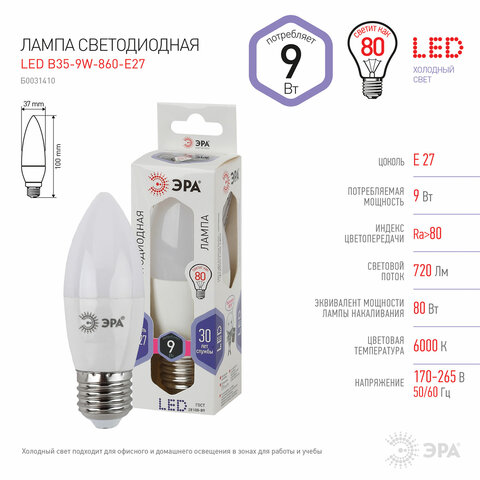 Лампа светодиодная ЭРА STD, 9 (80) Вт, цоколь E27, свеча, холодный белый свет, 35000 ч., LED B35-9W-860-E27, Б0031410