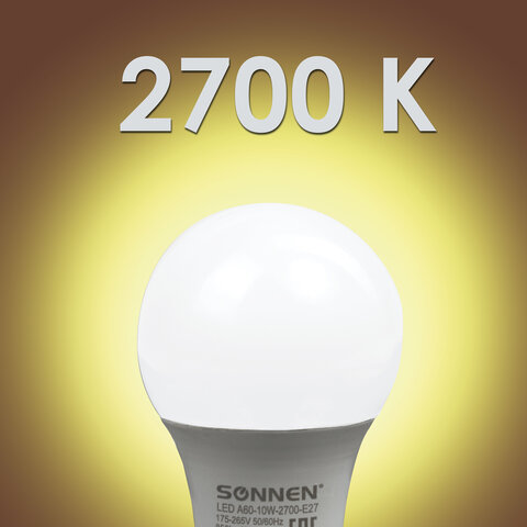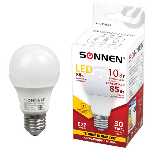Лампа светодиодная SONNEN, 10 (85) Вт, цоколь Е27, груша, теплый белый свет, 30000 ч, LED A60-10W-2700-E27, 453695
