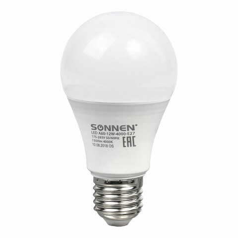 Лампа светодиодная SONNEN, 12 (100) Вт, цоколь Е27, груша, нейтральный белый свет, 30000 ч, LED A60-12W-4000-E27, 453698