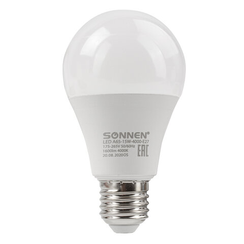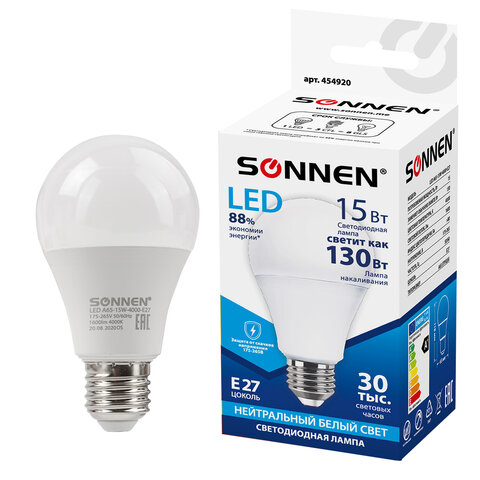 Лампа светодиодная SONNEN, 15 (130) Вт, цоколь Е27, груша, нейтральный белый, 30000 ч, LED A65-15W-4000-E27, 454920