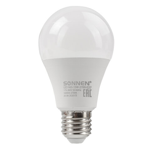 Лампа светодиодная SONNEN, 15 (130) Вт, цоколь Е27, груша, теплый белый, 30000 ч, LED A65-15W-2700-E27, 454919