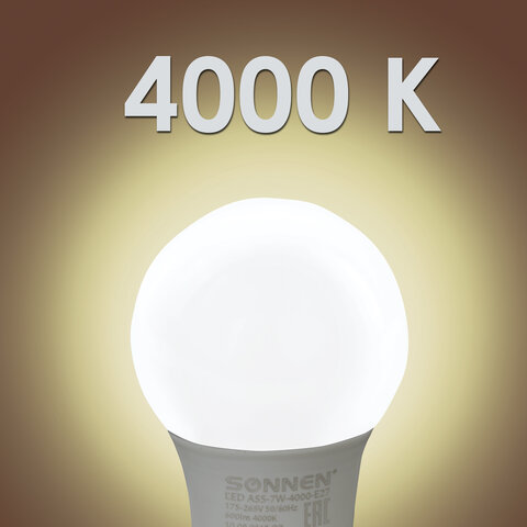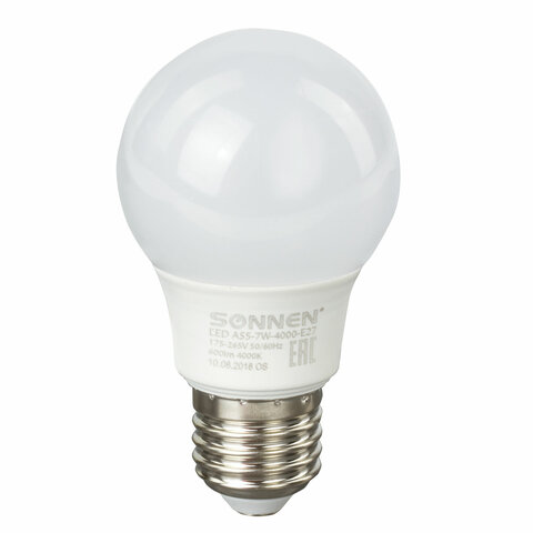 Лампа светодиодная SONNEN, 7 (60) Вт, цоколь Е27, груша, нейтральный белый свет, 30000 ч, LED A55-7W-4000-E27, 453694
