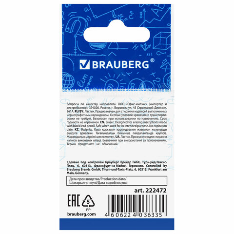 Ластик BRAUBERG "Universal" предназначен для удаления надписей, сделанных чернографитными карандашами.