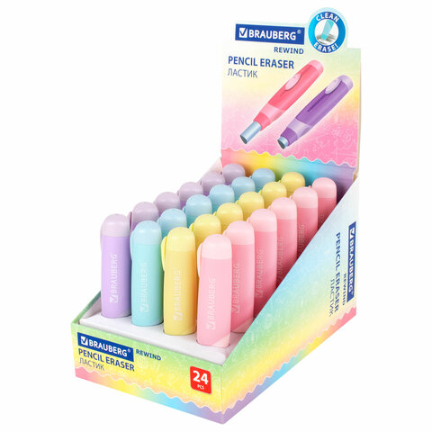 Ластик выдвижной BRAUBERG "REWIND", 112х21х24 мм, белый, пастельные цвета корпуса ассорти, 272686
