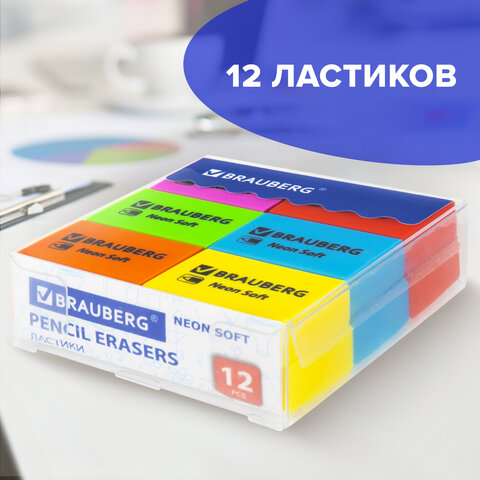 Ластики BRAUBERG NEON SOFT НАБОР 12 штук, размер ластика 31х20х10 мм, экологичный ПВХ, 271339