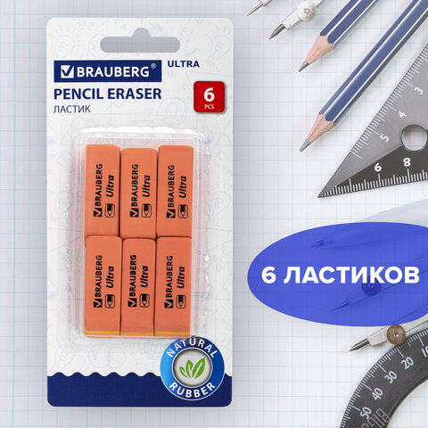 Ластики BRAUBERG "Ultra" НАБОР 6 шт., размер ластика 41х14х8 мм, оранжевые, натуральный каучук, 229601