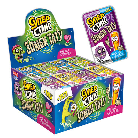 Мягкая карамель "Супер стик с тату ЗОМБИ" КАНДИ КЛАБ. С помощью карамельных палочек можно украсить стол на Новый год, 23 февраля, 8 марта и любой другой праздник. Временная татуировка точно восхитит любого ребёнка!