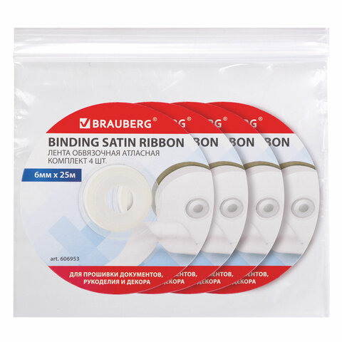 Лента обвязочная атласная БЕЛАЯ, КОМПЛЕКТ 4 шт., ширина 6 мм, длина 25 м, BRAUBERG, 606953