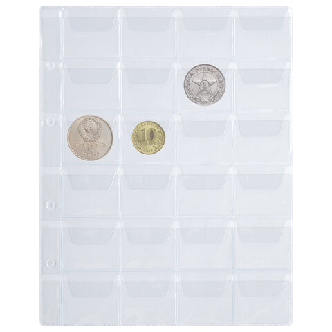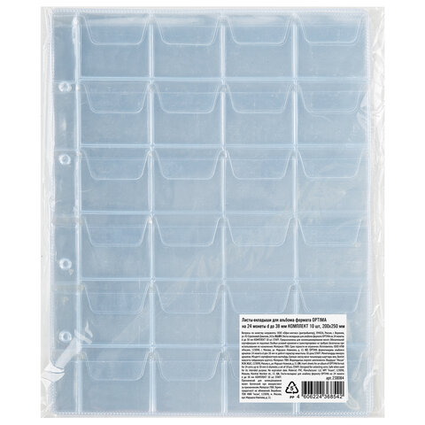 Листы-вкладыши для альбома "OPTIMA" на 24 монеты d до 38 мм, КОМПЛЕКТ 10 шт., 200х250 мм, ПВХ, STAFF, 238084