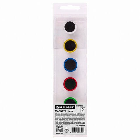 Магниты МОЩНЫЕ 20 мм (МАЛОГО ДИАМЕТРА), НАБОР 6 шт., ассорти, BRAUBERG "SUPER", 237477