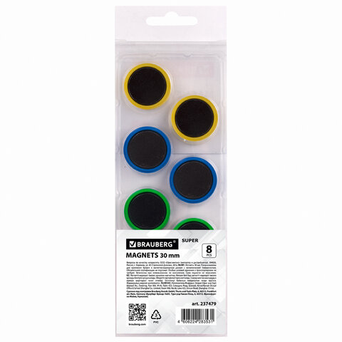 Магниты МОЩНЫЕ 30 мм, НАБОР 8 шт., ассорти, BRAUBERG "SUPER", 237479
