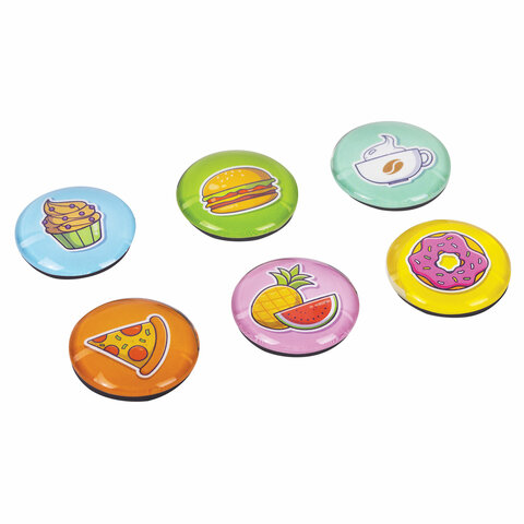 Магниты стеклянные 35 мм для досок магнитно-маркерных НАБОР 6 шт., "3D Street Food" BRAUBERG KIDS, круглые, блистер, 272515