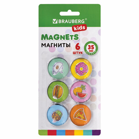 Круглые стеклянные магниты BRAUBERG KIDS с 3D-дизайном "Street Food" надежно прикрепляют листы бумаги к магнитно-маркерной поверхности досок, витрин, флипчартов и холодильников.