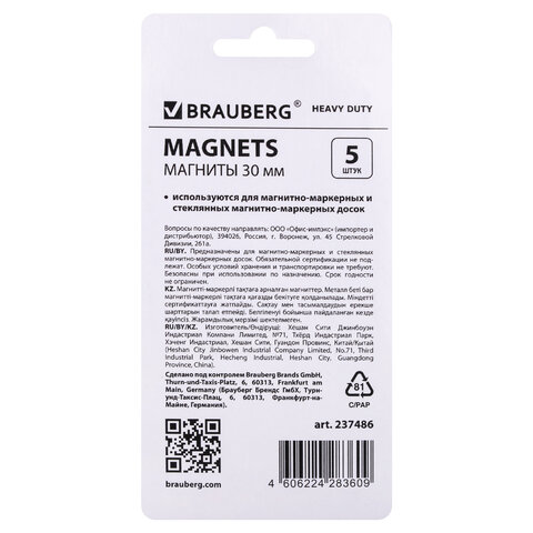 Набор мощных неодимовых магнитов BRAUBERG "HEAVY DUTY" используются для магнитно-маркерных и стеклянных магнитно-маркерных досок. Благодаря большой силе удерживают до 6 раз больше листов бумаги на магнитной поверхности.