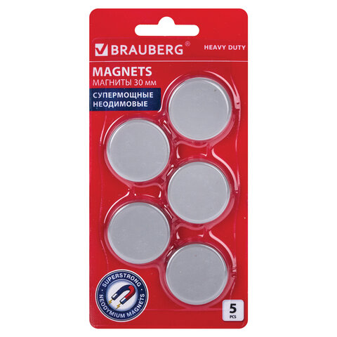 Магниты СУПЕРМОЩНЫЕ НЕОДИМОВЫЕ 30 мм, НАБОР 5 шт., серые, BRAUBERG "HEAVY DUTY", 237486