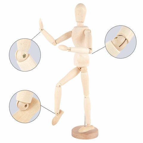 Манекен человека художественный BRAUBERG ART "CLASSIC" выполнен из натурального дерева и изображает человеческую фигуру с подвижными руками, ногами и головой. Он используется художниками для зарисовки различных поз человека.