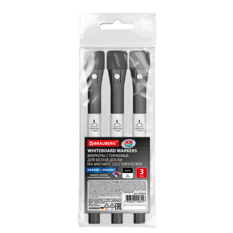 Маркеры на магните со стирателем для белой доски и планера, 3 шт., черные, BRAUBERG POP-ART, 1-2 мм, 152570