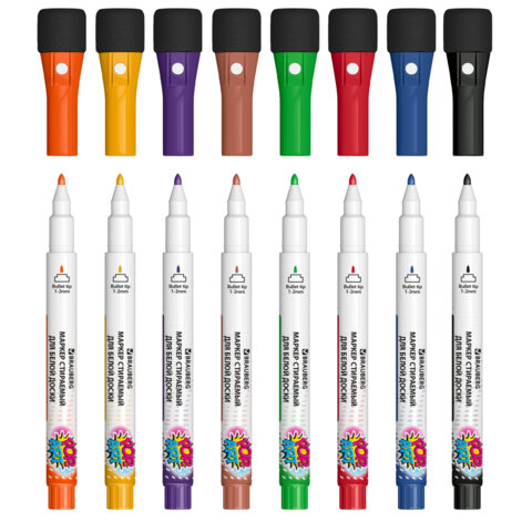 Маркеры на магните со стирателем для белой доски и планера, 8 цветов, BRAUBERG POP-ART, 1-2 мм, 152567