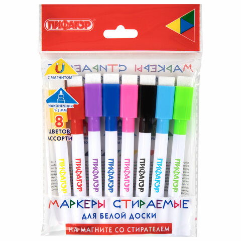 Маркеры стираемые 2 мм на магните со стирателем для белой доски и планера НАБОР 8 ЦВЕТОВ, ПИФАГОР, 152562