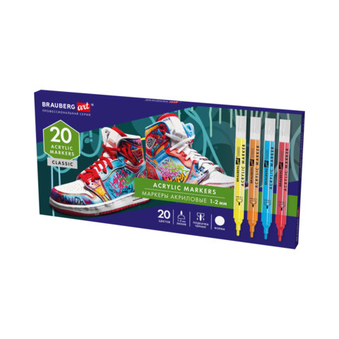 Маркеры акриловые для рисования и хобби, 20 ярких цветов, линия 1-2 мм, BRAUBERG ART CLASSIC, 152524