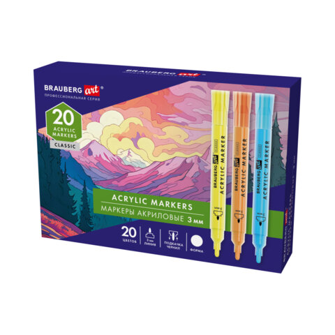 Маркеры акриловые для рисования и хобби, 20 ярких цветов, линия 3 мм, BRAUBERG ART CLASSIC, 152526