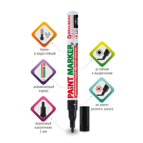 Маркер-краска лаковый (paint marker) 2 мм, ЧЕРНЫЙ, БЕЗ КСИЛОЛА (без запаха), алюминий, BRAUBERG PROFESSIONAL, 150868