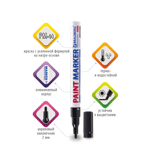 Маркер-краска лаковый BRAUBERG предназначен для маркировки различных материалов в промышленных условиях: бетона, дерева, стекла, металла, резины, пластика. Заправлен краской с усиленной формулой на нитро-основе РМ-14.