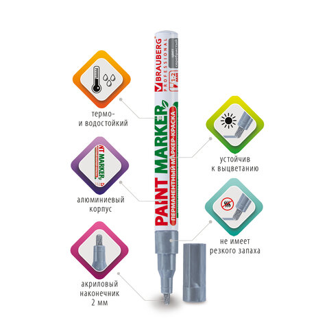 Маркер-краска лаковый (paint marker) 2 мм, СЕРЕБРЯНЫЙ, БЕЗ КСИЛОЛА (без запаха), алюминий, BRAUBERG PROFESSIONAL, 150866
