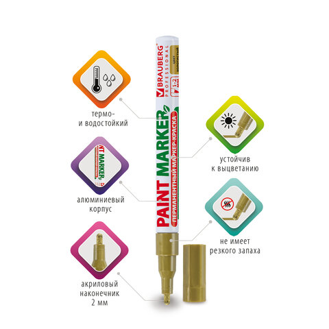 Маркер-краска лаковый (paint marker) 2 мм, ЗОЛОТОЙ, БЕЗ КСИЛОЛА (без запаха), алюминий, BRAUBERG PROFESSIONAL, 150867