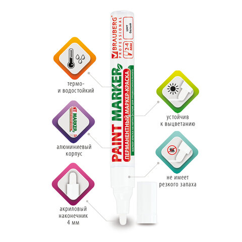 Маркер-краска лаковый BRAUBERG предназначен для маркировки различных материалов в промышленных условиях: бетона, дерева, стекла, металла, резины, пластика. Также подходит для творчества и декорирования.