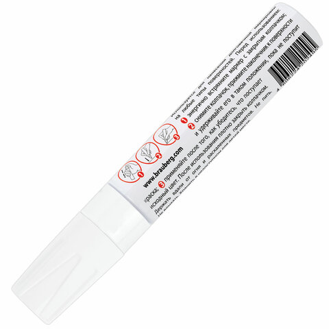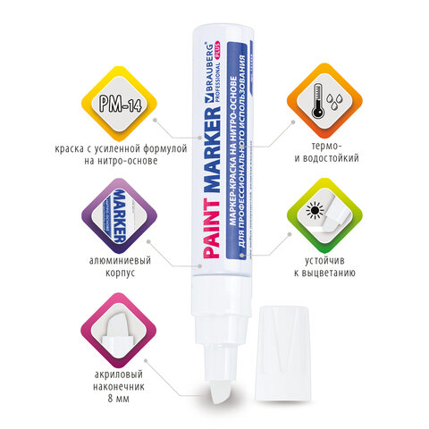 Маркер-краска лаковый BRAUBERG предназначен для маркировки различных материалов в промышленных условиях: бетона, дерева, стекла, металла, резины, пластика. Заправлен краской с усиленной формулой на нитро-основе РМ-14.