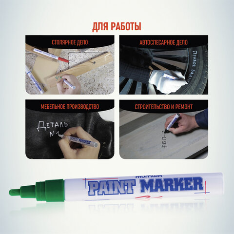 Маркер-краска не поддается атмосферным воздействиям и широко применяется в производстве для маркировки изделий из пластика, дерева, металла, камня, стекла, резины.