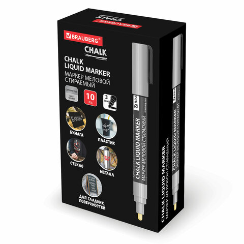 Стираемый меловой маркер BRAUBERG "CHALK" предназначен для создания рисунков и надписей на гладких и прозрачных невпитывающих поверхностях (например, зеркалах, стекле, меловой пленке). Подходит для школьных занятий, идеальны для детского творчества!