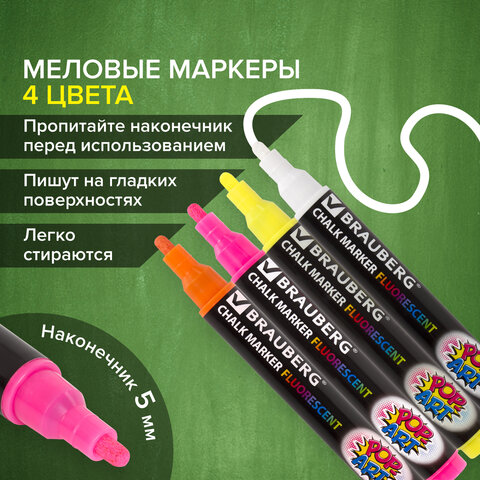 Маркеры меловые "POP-ART", НАБОР 4 ЦВЕТА, 5 мм, стираемые, для гладких поверхностей, BRAUBERG, 151535