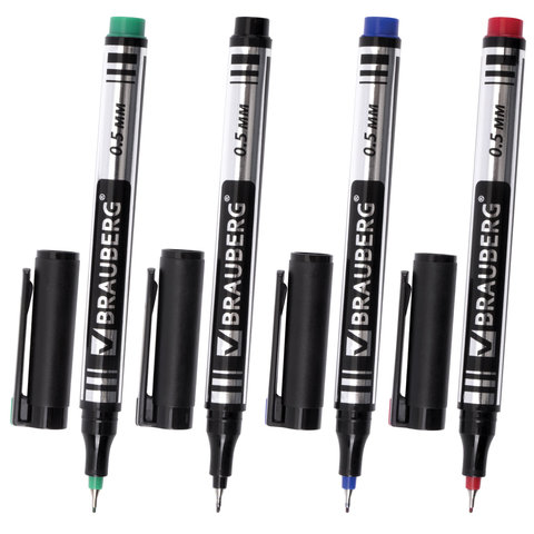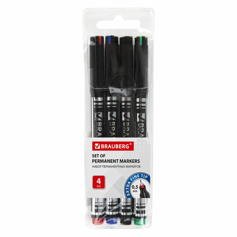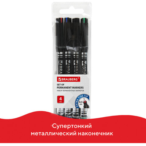 Маркеры перманентные BRAUBERG "Jet", НАБОР 4 ЦВЕТА, супертонкий металлический наконечник 0,5 мм, 150511