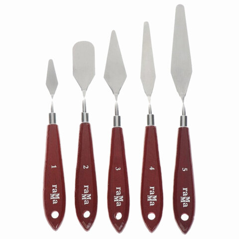 5 кованых мастихинов для начинающих художников и обучения живописи. Лезвие из нержавеющей стали, гладкая плоская ручка из натурального бука, удобная коробка для хранения.