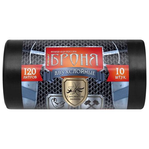 Мешки для мусора 120 л, ПРОЧНЫЕ черные, в рулоне 10 шт., ПВД 60 мкм, 2-х слойные, 70x110 см, "БРОНЯ", ВР-0010