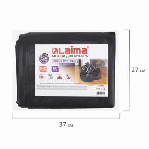 Мешки для мусора 240 л черные, в пачке 20 шт., ОСОБО ПРОЧНЫЕ, ПВД 60 мкм, 90х140 см, LAIMA, 609339