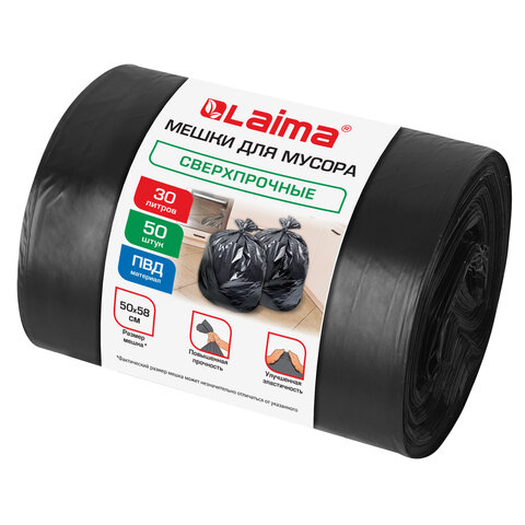 Мешки для мусора 30 л, черные, в рулоне 50 штук, сверхпрочные, ПВД 30 мкм, 50x58 см, LAIMA, 702650
