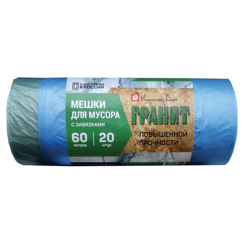 Мешки для мусора, 60 л, завязки, синие, в рулоне 20 шт., ПНД, 15 мкм, 60х70 см, прочные, КОНЦЕПЦИЯ БЫТА "Гранит", 1022