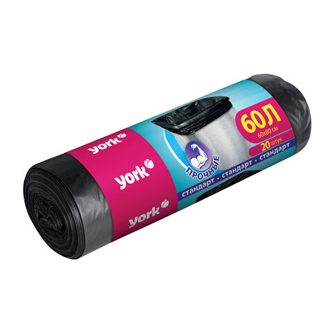 Мешки для мусора 60л, черные, в рулоне 20шт, ПНД, 6мкм, YORK, 902140