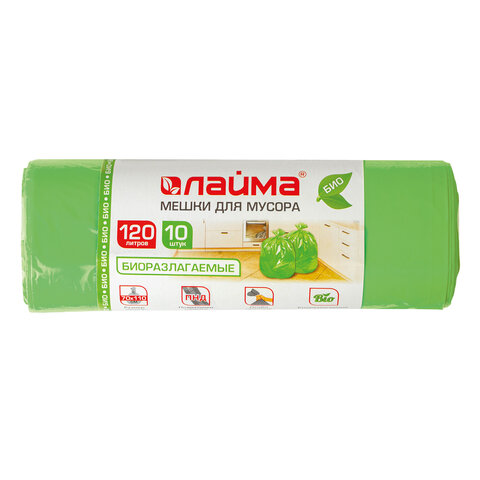Мешки для мусора биоразлагаемые 120 л, зеленые, в рулоне 10 шт., ПНД 17 мкм, 70х110 см, LAIMA, 601402