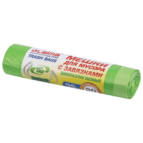 Мешки для мусора биоразлагаемые с завязками LAIMA "ULTRA" 35 л, рулон 20 шт., прочные, ПНД 15 мкм, 50х60 см, 607688