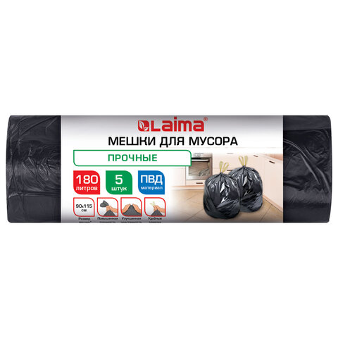 Мешки для мусора с завязками 180л черные в рулоне 5 штук прочные, ПВД 45 мкм, 90x115см, LAIMA, 702676