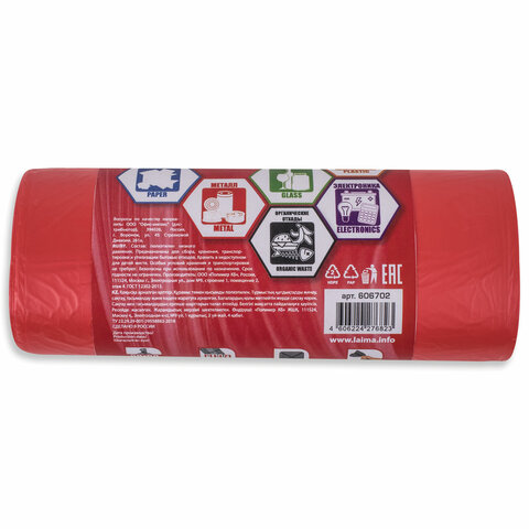 Мешки для раздельного сбора мусора 60 л красные, в рулоне 20 шт., ПНД 10 мкм, 58х68 см, LAIMA, 606702, 3811