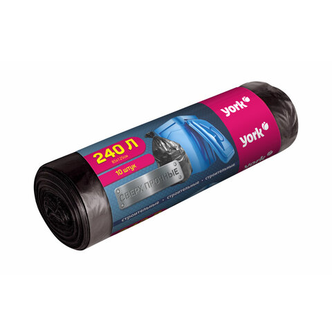 Мешки строительные для мусора 240л, черные, в рулоне 10шт, ПВД, 28мкм, YORK, 902230