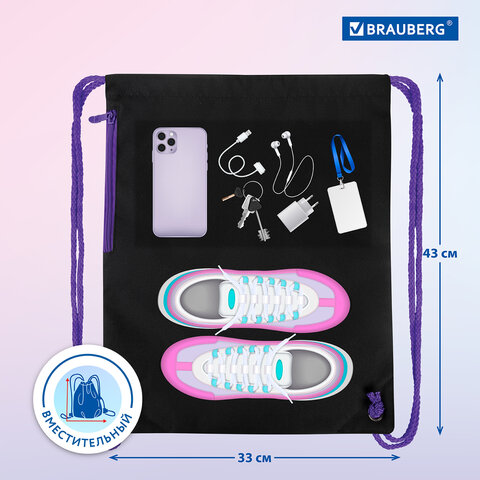 Мешок для обуви BRAUBERG PREMIUM – необходимый аксессуар в школе! Подходит для сменной обуви и спортивной формы. Затягивается двумя шнурками. Можно носить на плечах за спиной.